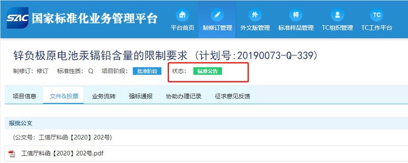 2021年4月28日,由苏州大学化学电源研究所承担的强制性国家标准《锌负极原电池汞镉铅含量的限制要求》(标准编号:GB 24427-2021)修订计划项目通过国家标准化管理委员会的审核并发布了公告。
