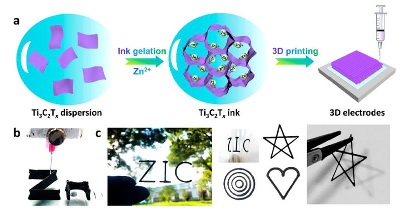 构建具有高能量/功率密度的水系锌离子混合电容器(ZIC)具有重要意义。然而常规碳材料由于其有限的比表面积无法存储大量锌离子;同时,传统的平面电极中有限的孔隙结构导致活性材料的利用率低,成为ZIC器件性能提升的瓶颈。3D打印是构建储能系统的一种新兴技术。得益于相互连接的框架和丰富的孔结构,3D打印电极通常表现出良好的电化学性能。打印结构的机械稳定性关键在于具有良好流变性和剪切变稀行为的墨水,然而,在形成墨水的过程中,经常需要加入添加剂来调节其流变性能,这些添加剂通常需要繁琐的后处理,并可能影响活性材料容量的发挥。