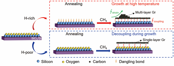 石墨烯的直接生长在绝缘体上提供晶圆级均匀性对于电子和光电应用至关重要。然而,迄今为止它仍然是一个挑战,因为它需要一种与金属完全不同的增长模式。本文苏州大学刘忠范/孙靖宇课题组/黄丽珍、中国石油大学(华东)赵文、中国科学院国家纳米科学中心高腾等研究人员在 Advanced Materials期刊发表名为“Transfer-Free Quasi-Suspended Graphene Grown on a Si Wafer”的论文,研究使用界面去耦化学气相沉积策略展示了准悬浮石墨烯在硅晶片上的无金属催化剂生长。