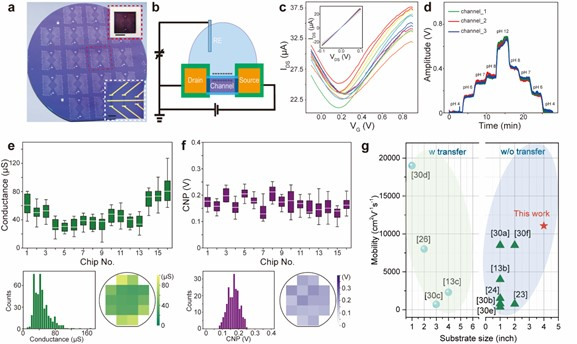 图5. 在硅晶片上生长的无转移准悬浮石墨烯的器件性能