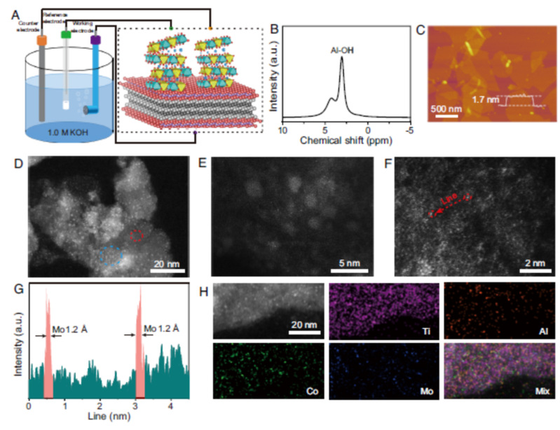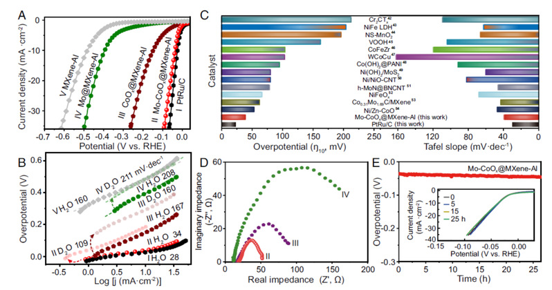 近日,耿凤霞教授课题组通过电化学自优化的手段剥离负载在铝氧阴离子修饰的碳化钛(Ti3C2)MXene基底上MoCoOx前驱体,精细地制备出包含单原子Mo, CoOx团簇和铝氧阴离子修饰的碳化钛(Ti3C2)MXene基底的三元催化界面。得益于CoOx团簇较强的水裂解性能, 单原子Mo吸附聚合质子的能力,以及AlOx-基团上桥接氧的存在增加了催化剂的Brønsted酸度,其具有可逆的吸脱附质子特点,从而确保了碱性环境中的HER反应遵循富质子(类酸环境)状态下的最快速Volmer-Tafel析氢机制。相应的性能测试表明,Mo-CoOx@MXene-Al复合催化剂表现出优异碱性HER催化性能,驱动10 mA/cm2的电流密度仅需要39 mV的过电位,Tafel斜率低至34 mV/dec,表现出媲美商业双贵金属PtRu/C催化剂的性能。更重要的是,这种精细调控的复合催化剂经过25小时的循环测试后,没有表现出明显的活性衰减,显示出较高的实用价值。