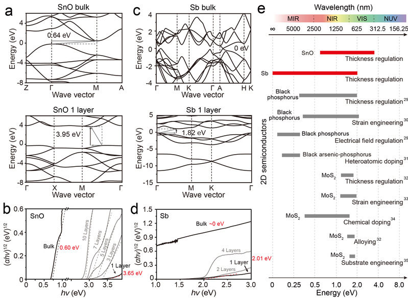 通过压延-机械剥离得到的金属Sb成为带隙为2.01 eV的半导体; SnO的带隙从块体样品的红外(IR) 0.60 eV调节到单层样品的紫外(UV) 3.65 eV,是迄今为止报道的二维材料半导体中最大的。