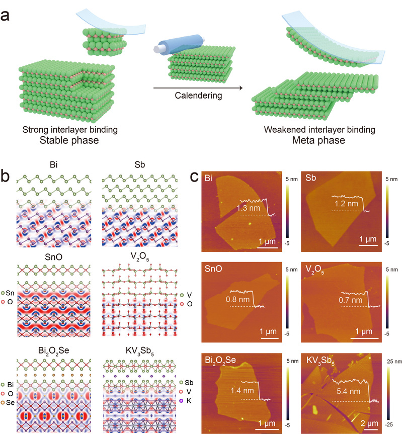 近日,耿凤霞教授课题组开发了一种针对非范德华层状结构材料的剥离方法,基于垂直堆积方向上相对较低的堆积密度,采用机械压延的方式诱导相邻层发生位错移动或滑动,将材料从稳态转变为亚稳态,有效削弱了层间结合能,结合机械剥离法成功获得了一系列单层或少层二维材料,包括金属材料Bi、Sb,半导体材料SnO、V2O5、Bi2O2Se和超导化合物KV3Sb5。